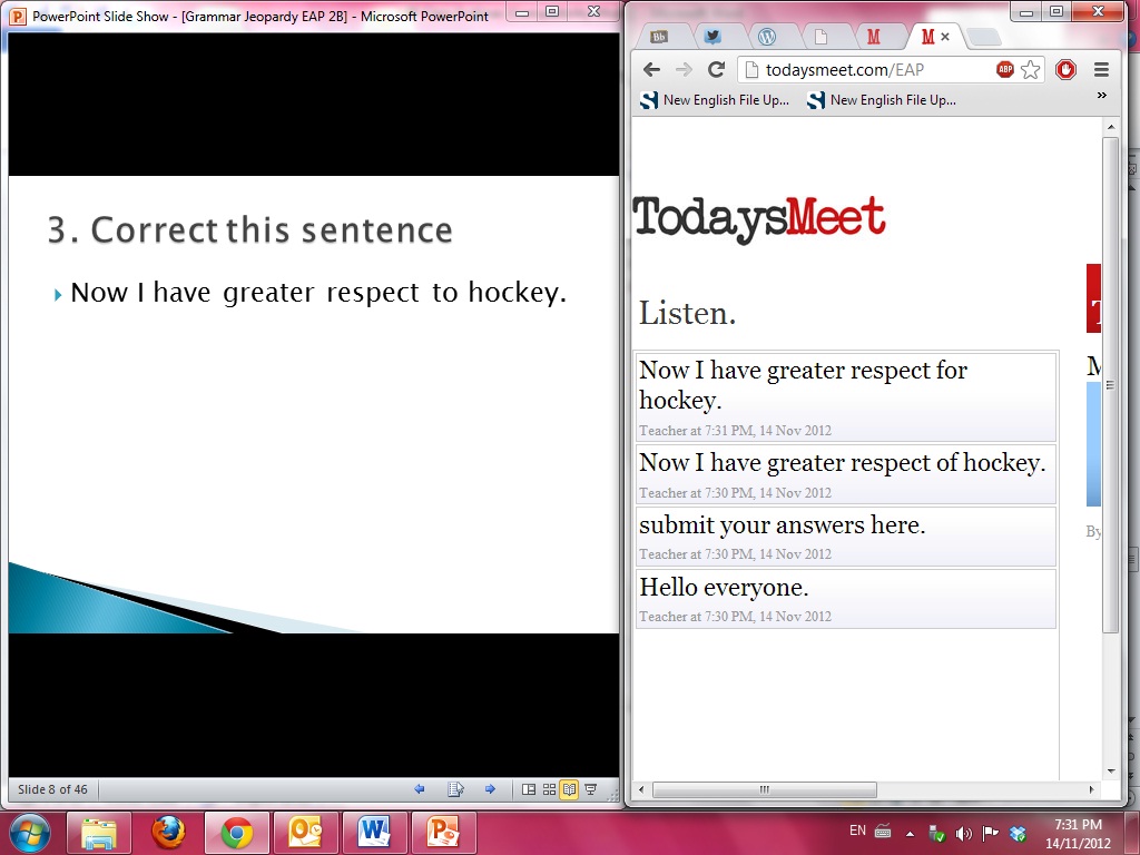 5) Explain the rules: You’ll put the question up, and the groups have to work together, find the answer, and submit their correction via the chatroom. Give points for both speed and accuracy–it makes it more fun! (I gave 2 points if the answer was correct and the first to be submitted, and 1 if it was correct , but not the first answer to appear. Also figure out how many points you’ll give for a “steal”, second attempt, etc.)