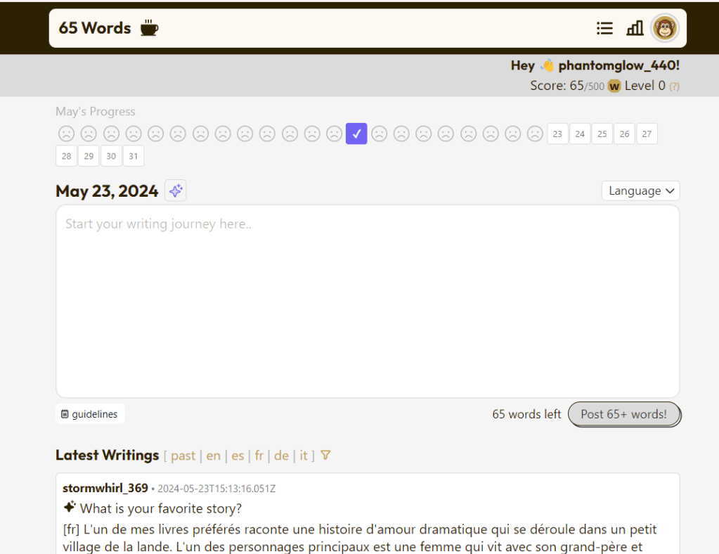 65 Words is a super simple website for language learners to build written fluency where you’re encouraged to write (a minimum of) 65 words daily in your target language. You can see others’ texts, and even jump in and correct them if you’d like. There are some simple tracking features, and a scoring system based on how many words you write over time. It’s very simple, no bells and whistles, but as a beginner, it’s all I need!