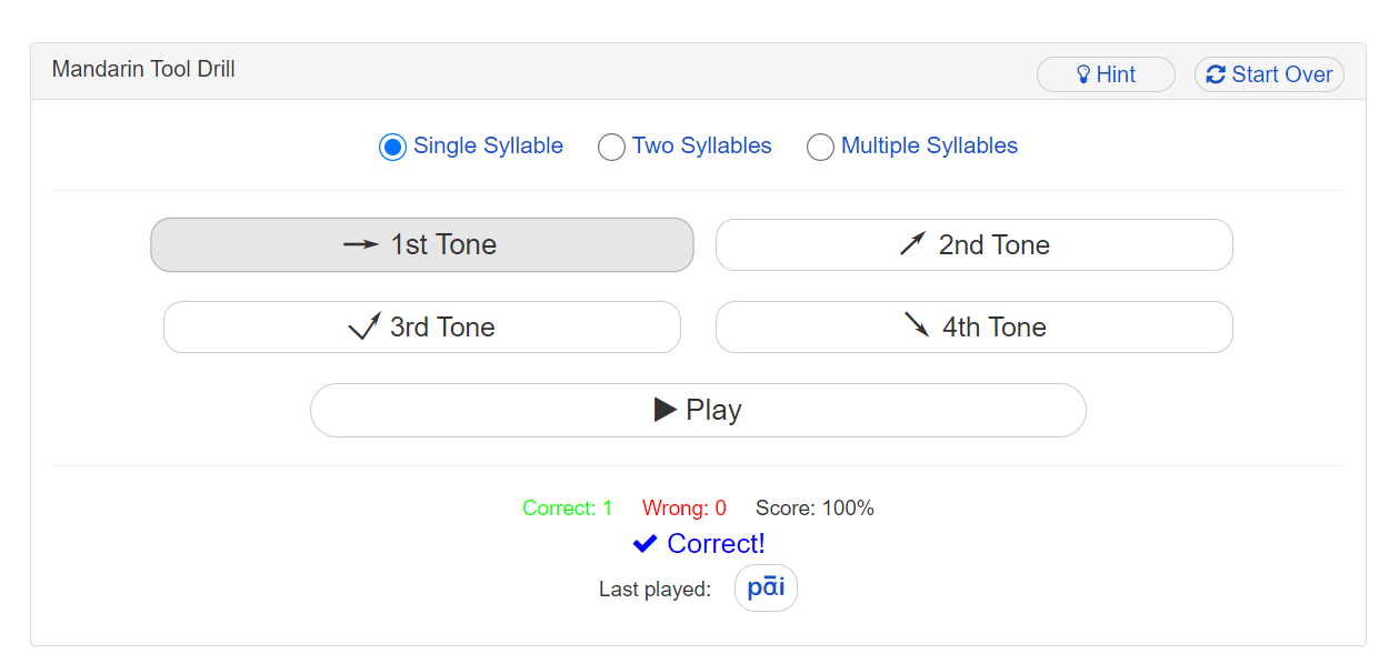 ArchChinese.com has a whole host of Mandarin-learning resources, but the one I have used the most is the Mandarin Chinese Tone Drill. It’s also a super simple site, where it plays a recording of a word (single, double, or multi-syllabic word options), and you identify which tones you hear, and it tells you if you’re right or not! That’s it! But it’s been really great practice to develop my ear for tones.